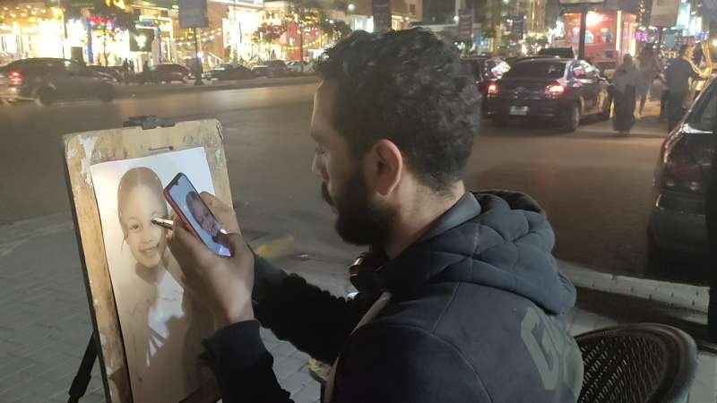 يعمل جاهداً من أجل توفير احتياجات أسرته، سعيد شاب من عمر ٣٥ عاماً، يعمل رساماً بشارع عباس العقاد منذ أكثر من ١٠ سنوات.