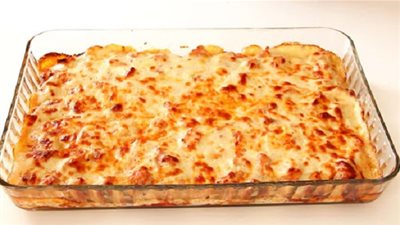 - ثم يتم وضع الخبز المحمص في صينية بايركس ويضاف عليه القليل من المرق.