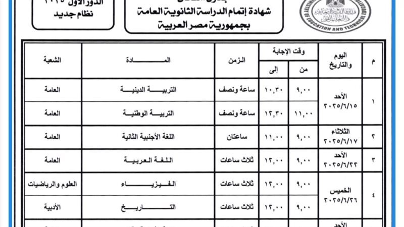 - جدول امتحانات الثانوية العامة 2025 علمي رياضة النظام الجديد