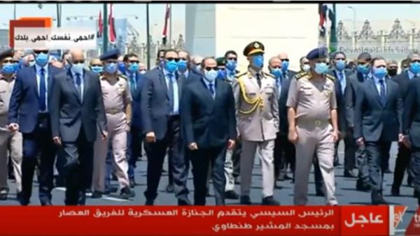 تقدم الرئيس عبد الفتاح السيسي، الجنازة العسكرية للفريق محمد سعيد العصار وزير الانتاج الحربي من مسجد المشير طنطاوي.