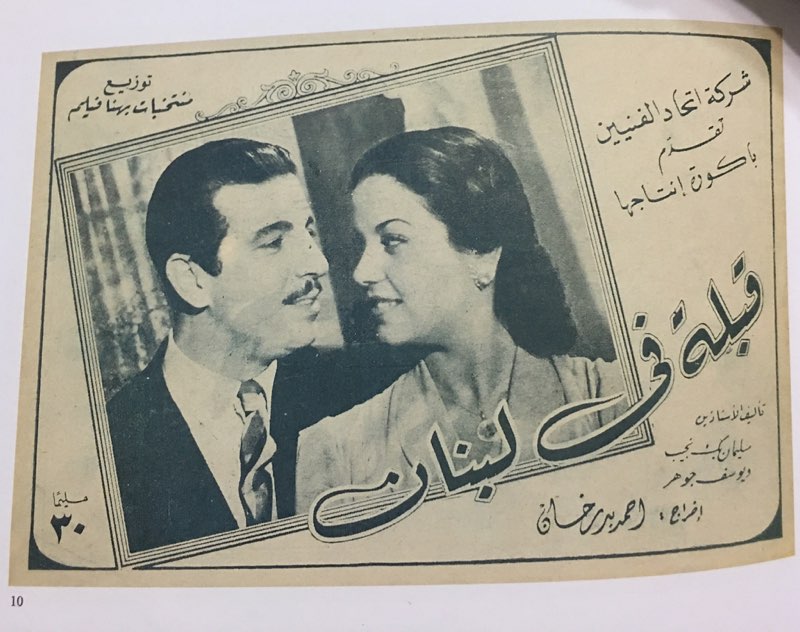 أما فيلم "قبلة فى لبنان"، والذي كان من بطولة الفنان أنور وجدى، ومديحة يسرى، ومحمد فوزى، وفؤاد شفيق، وسليمان نجيب، ومن تأليف يوسف جوهر، ومن إخراج أحمد بدر خان، فكانت سعر تذكرته 30 مليما فى عام 1945، وتدور أحداث الفيلم حول فتحية، التي قدمتها مديحة يسرى، والتي تسافر إلى لبنان لقضاء فترة نقاهة، تاركة وراءها زوجها سامي، وتتعرف فتحية على شاب مصري في لبنان في الوقت الذي يقع فيه زوجها سامي في غرام سعاد اللعوب، ويقضي معها أوقاته.
