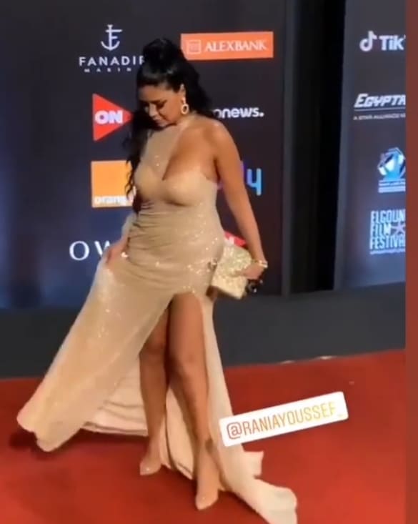 صدمت الفنانة رانيا يوسف الجميع خلال حضورها افتتاح مهرجان الجونة السينمائي في دورته الرابعة، بفستان وصفه النشطاء بالفاضح، وهو فستان جرىء بصلي اللون مفتوحاً من الأمام فوق الركبة بدون أكمام، كما أنه مفتوح الصدر بطريقة جريئة وهو ما فتح عليها موجة من الغضب لتعمد إظهار جسدها بشكل جرىء.