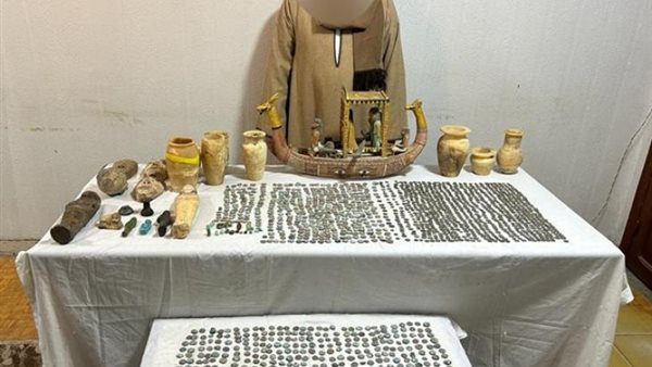 فى إطار جهود أجهزة وزارة الداخلية لمكافحة الجريمة بشتى صورها لاسيما جرائم الإتجار غير المشروع بالقطع الأثرية.. فقد أكدت معلومات وتحريات قطاع شرطة السياحة والآثار بالتنسيق مع قطاع الأمن العام بمشاركة مديرية أمن المنيا حيازة موظف بالمعاش "له معلومات جنائية قطع أثرية بقصد الإتجار بمسكنه الكائن بدائرة مركز شرطة مغاغة بالمنيا عقب تقنين الإجراءات تم إستهدافه وأمكن ضبطه.. وبتفتيش مسكنه عُثر على مركب خشبى عليه نقوش وكتابات فرعونية عليها عدد ٧ تماثيل خشبية - عدد ٩ أوانى ألباستر مختلفة الأشكال والأحجام و٣ وجوه خشبية- عدد ٢ مزهرة من الزجاج - عدد ٣ تماثيل مختلفة الأشكال والأحجام عليها نقوش فرعونية تمثال لسيدة من الحجر الملون عليه نقوش فرعونية - تمثال لسيدة فى الوضع الأزورى ملون من الحجر عليه نقوش وكتابات هيروغليفية - تمثال لفرس النهر- عدد ١٧ تميمة مختلفة الأشكال "وجميعهم قطع أثرية تعود لعصور فرعونية مختلفة - عدد ١٧٩٥ عملة معدنية مختلفة الأشكال والأحجام تعود للعصر اليونانى الرومانى وبمواجهته إعترف بحيازته لها بقصد الإتجار، وبإجراء المعاينة المبدئية بمعرفة مفتشى الآثار أفادوا بأن القطع المضبوطة أثرية.تم إتخاذ الإجراءات القانونية.