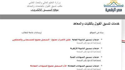 تم الانتهاء من مرحلة تقليل الاغتراب (التحويلات) لطلاب المرحلتين الأولى والثانية عبر الموقع الإلكتروني للتنسيق، سواء للتحويلات المناظرة أو غير المناظرة، وبنسبة 10% وفقًا للشروط المحددة من المجلس الأعلى للجامعات.