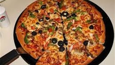 نوزع الزيتون والجبن والمكونات الأخرى على العجينة بالتساوي، ثم نضعها في الفرن على درجة حرارة متوسطة لمدة 20 دقيقة. بعد ذلك، نقطع البيتزا وتُقدم ساخنة.