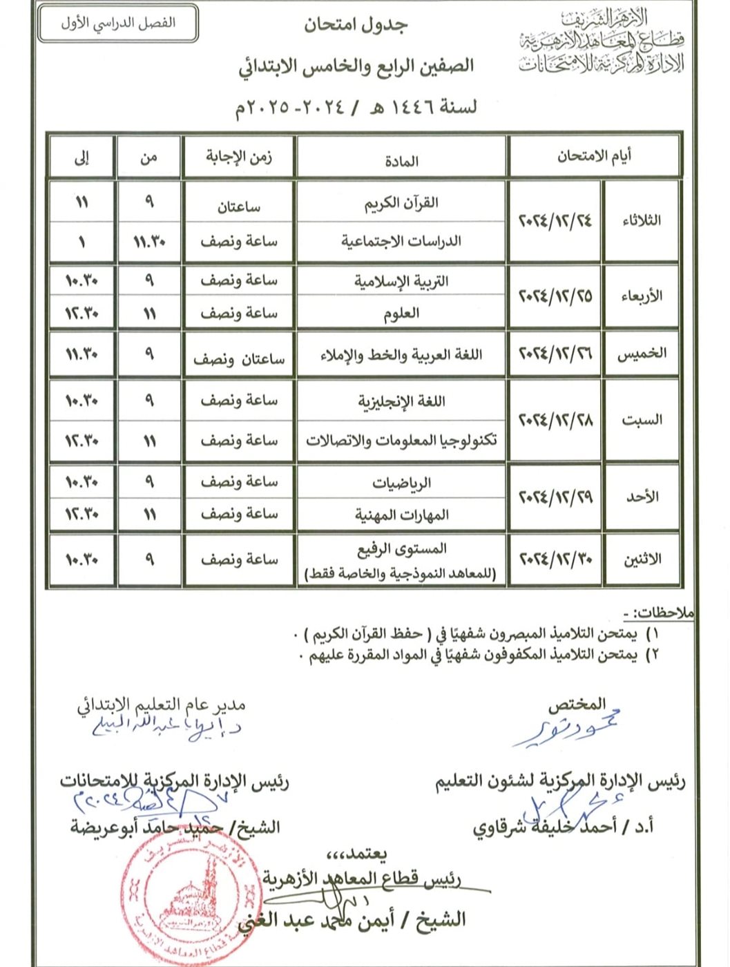 جدول امتحانات الترم الاول للمرحلة الابتدائية بالأزهر