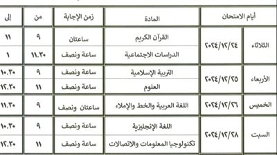 - جدول امتحانات الصف الاول الاعدادي الأزهري يوم الثلاثاء 24 ديسمبر 2024، سيتم امتحان أصول الدين "ورقة أولى، التفسير والحديث" من 9:00 إلى 10:30، ثم امتحان العلوم من 11:00 إلى 12:30 ظهرًا.