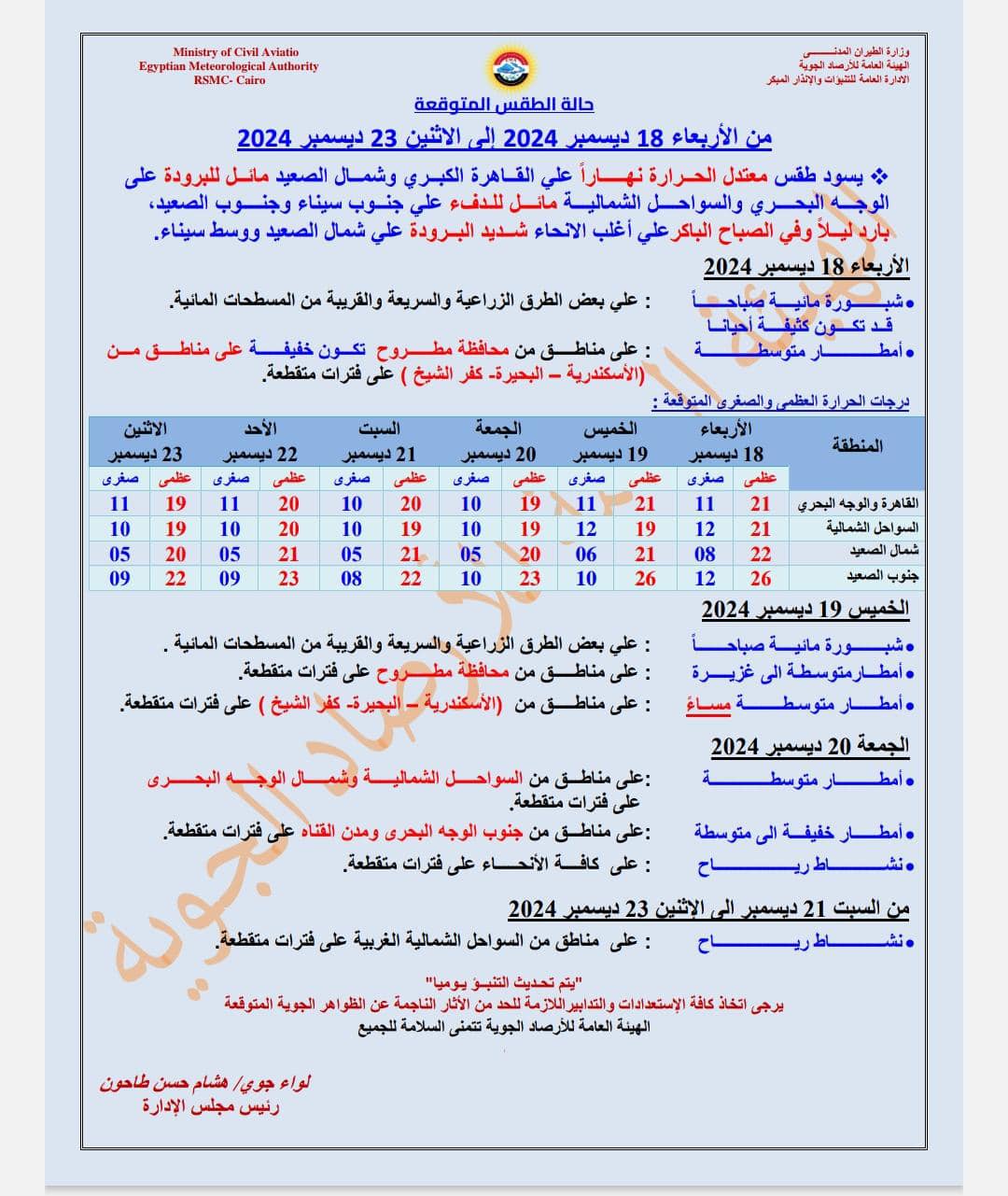وفيما يتعلق بحالة الطقس في الأيام المقبلة، فمن المتوقع استمرار الانخفاض التدريجي في درجات الحرارة، وسقوط أمطار متوسطة إلى غزيرة علي مناطق من محافظة مطروح، وكذلك سقوط أمطار متوسطة علي مناطق من الأسكندرية والبحيرة وكفر الشيخ علي فترات متقطعة. يصاحب ذلك تكون الشبورة المائية، ونشاط للرياح مما يزيد من الإحساس ببرودة الطقس.