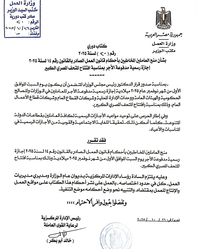 وزير العمل يحسم مصير إجازة 1 نوفمبر في القطاع الخاص لافتتاح المتحف المصري الكبير