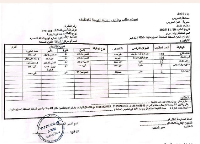 وظائف وزارة العمل.. طرحت وزارة العمل 275 فرصة عمل جديدة بمحافظة السويس بالتعاون مع شركة “إيليت سولار”، في خطوة تستهدف دعم تشغيل الكفاءات المحلية وربط الباحثين عن العمل بفرص حقيقية داخل سوق يشهد توسعًا في الصناعات المرتبطة بالطاقة.