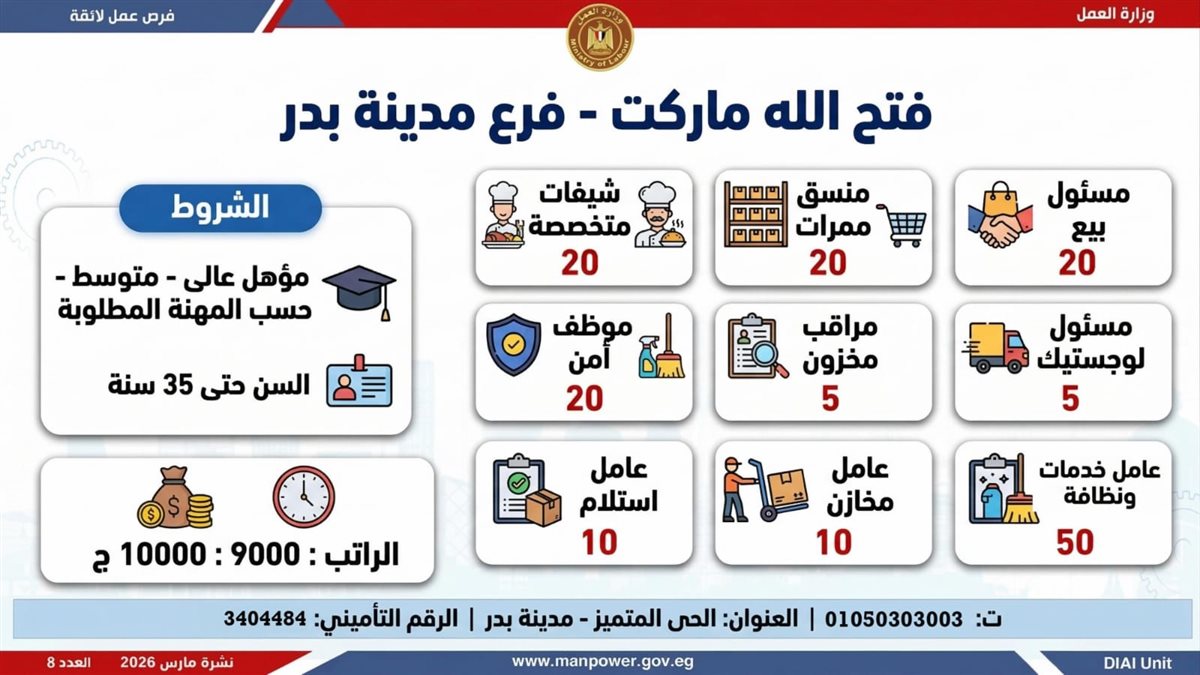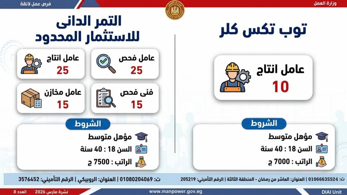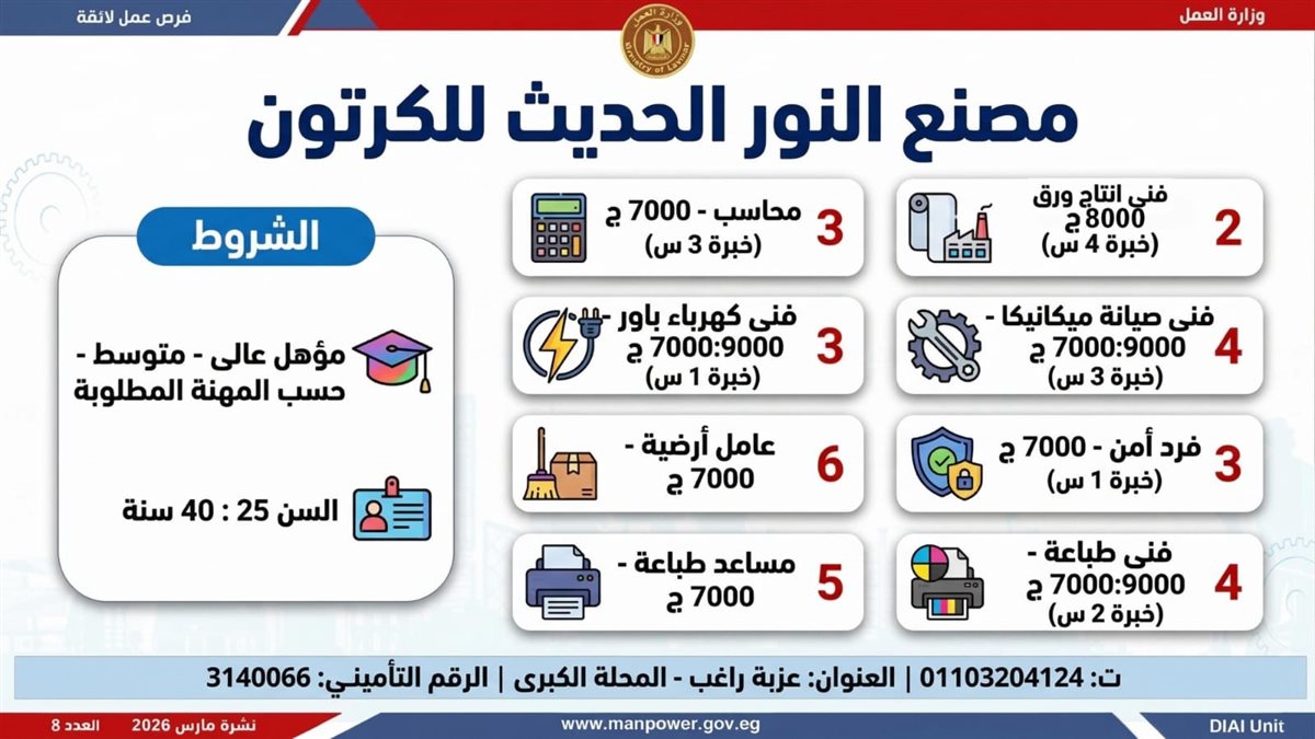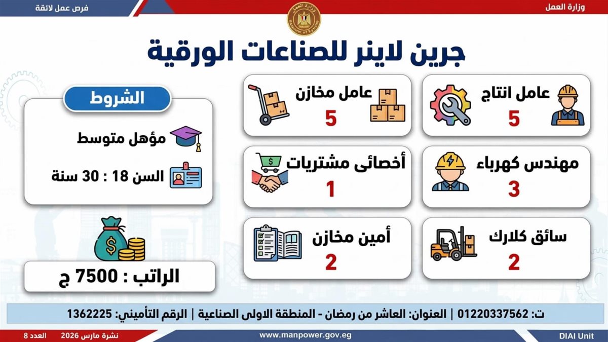 وبيّنت الوزارة في بيان لها أن النشرة تضم فرصًا متنوعة في عشرات التخصصات والمهن، برواتب مجزية تُحدد وفق طبيعة الوظيفة والمقابلة الشخصية، مع التزام كامل بتطبيق الحد الأدنى للأجور، والاستفادة من مظلة التأمينات الاجتماعية والصحية.