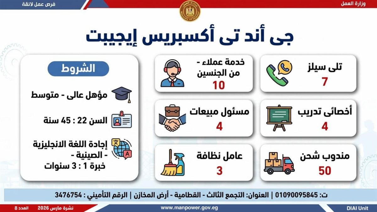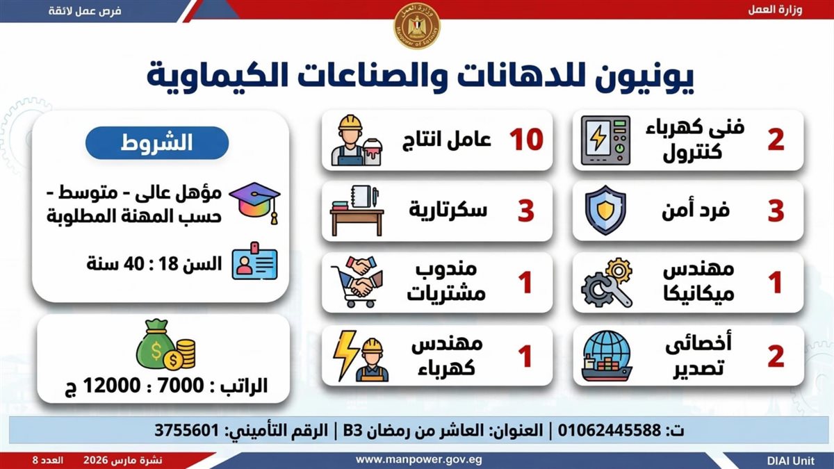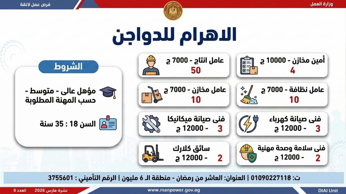 أصدرت وزارة العمل، اليوم الاثنين، نشرة التوظيف الأسبوعية، متضمنة 2289 فرصة عمل، بالتعاون مع 34 شركة من شركات القطاع الخاص، موزعة على 9 محافظات، مع فتح باب التقديم خلال شهر مارس 2026 الجاري، في خطوة تستهدف دعم تشغيل الشباب وتعزيز سوق العمل.